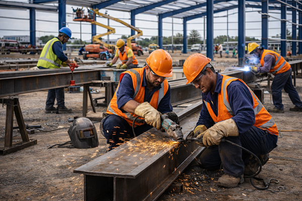Site fabrication means cutting, welding, and assembling steel parts at your construction site instead of inside a factory.